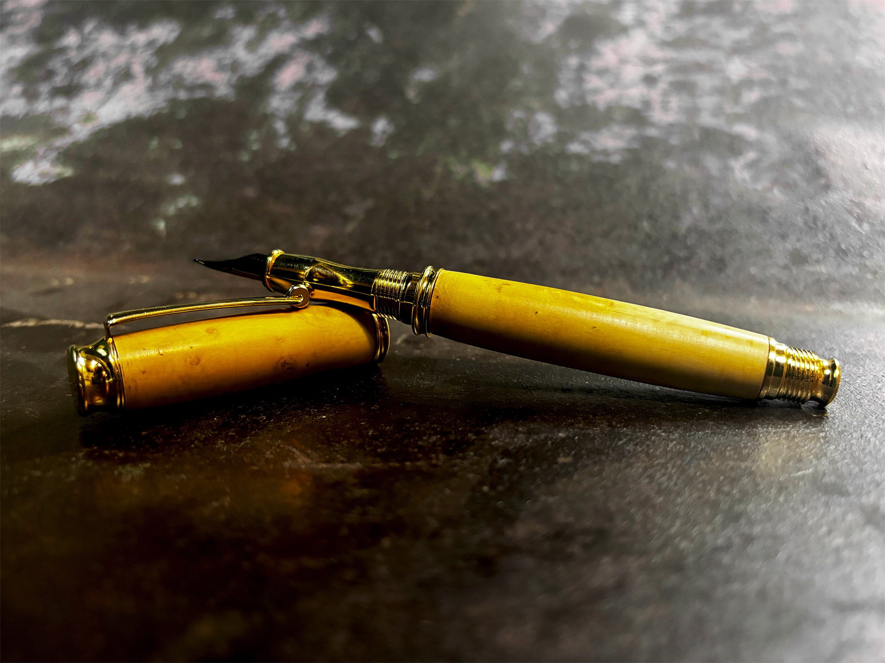 Custom, hand-turned on a lathe collected from Old English Boxwood from the Hall House in Salisbury. The pen has a medium nib, which gives it a soft feel. The pen utilizes regular ink pen cartridges which are easy to replace. The pen features a natural finish.